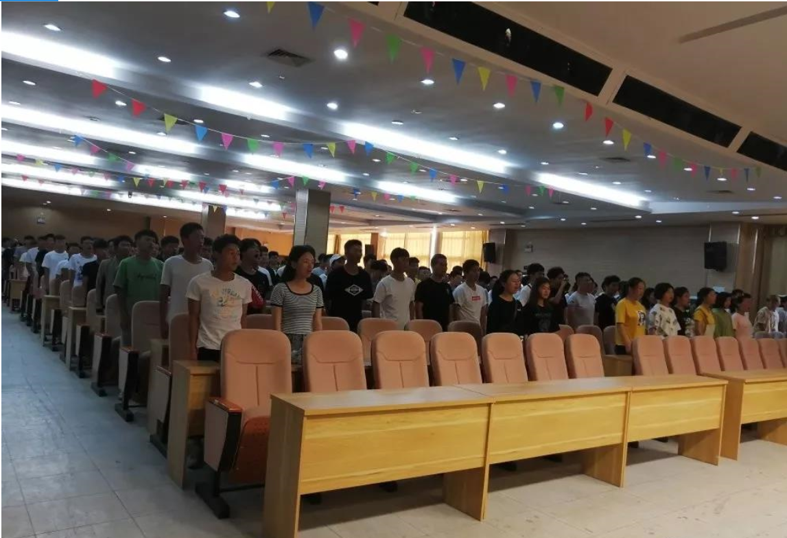上午8点半,2019级新生开学典礼正式开始。全体起立,奏唱国歌。整齐洪亮的国歌声在会场里飘扬,展现了2019级新生们的浓浓爱国之情以及身为中华儿女的自信与骄傲。