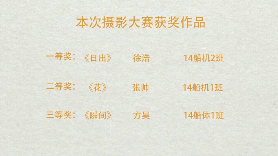 此次活动经过了为期20天的宣传征集作品阶段,经过评选,14船机2 班徐浩同学的《日出》获得第一名,亚军和季军分别由14船机1班张帅和14船体1 班方昊两位同学获得。