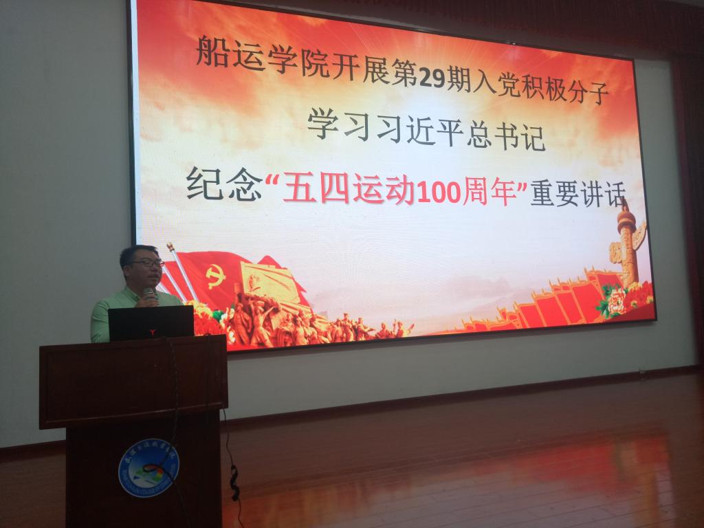开展入党积极分子培训是党员发展工作的重要环节,是熟悉和掌握党的基本知识、基本理论的基本需要,积极参加培训不仅是一次难得的机会,也是政治生活的一件大事,更是在人生道路上迈出的重要一步。为此,5月9日,船运学院学生党支部组织我院29期入党积极分子学习“习近平总书记纪念五四运动100周年重要讲话”党日活动。