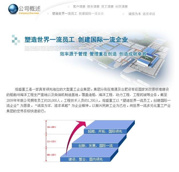 熔盛重工是一家具有领先地位的大型重工企业集团,集团分别在南通及合肥设有经国家发改委核准建设的船舶与海洋工程生产基地以及柴油机制造基地,覆盖造船、海洋工程、动力工程、工程机械等业务,截至2009年年底公司拥有员工约20,000人,工程技术人员约1,500人。熔盛重工以“塑造世界一流员工,创建国际一流企业”为愿景,“诚信为本、追求卓越”为企业精神,以振兴民族工业为己任,向世界一流多元化重工产业集团的宏伟目标快速前行