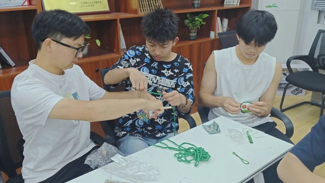 “老师,我的艾草锤像不像’流星锤’?”航海技术专业学生程好举起刚完工的手作——青绿色布料裹着艾草团,五彩线绳在顶端缠成绣球状。围坐的同学笑成一片,有人掏出手机拍下“买家秀”,有人把彩绳系在手腕上比造型。艾草香混着薄荷味,在团辅室里轻轻浮动。