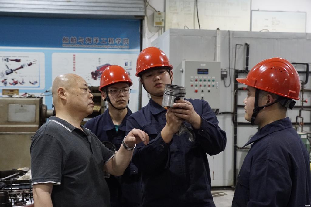 晚上九点多的校园,重型实训楼一楼,“船舶主机和轴系安装”大赛备赛的师生们仍然在忙碌。他们头戴安全帽,身穿工作装,脚踩专用劳保防护鞋,三人一组,进行柴油机拆装和调试的训练,春末夏初的季节里已经挥汗如雨。