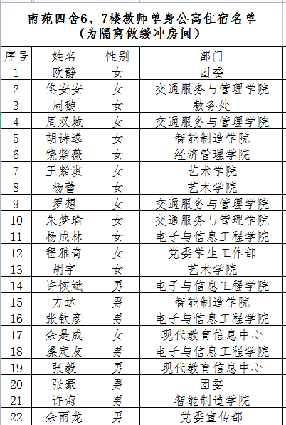 南苑四舍6楼、7楼腾出房间教师名单(总务处提供)