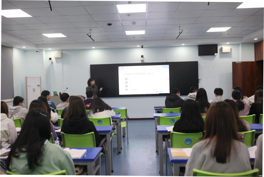 “同学们,今天除了在座的各位,还有因疫情暂时不能返校的7位同学线上跟我们一起学习。刚刚同学们已经扫码进入了我们的课堂。来,线上的同学跟大家打个招呼,你们都在嘛?”经济管理学院的王珏老师热情地跟线上的同学互动。