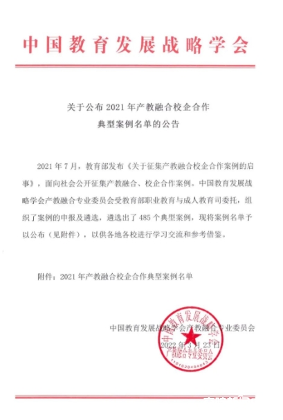 我校选送案例成功入选2021年产教融合校企合作典型案例