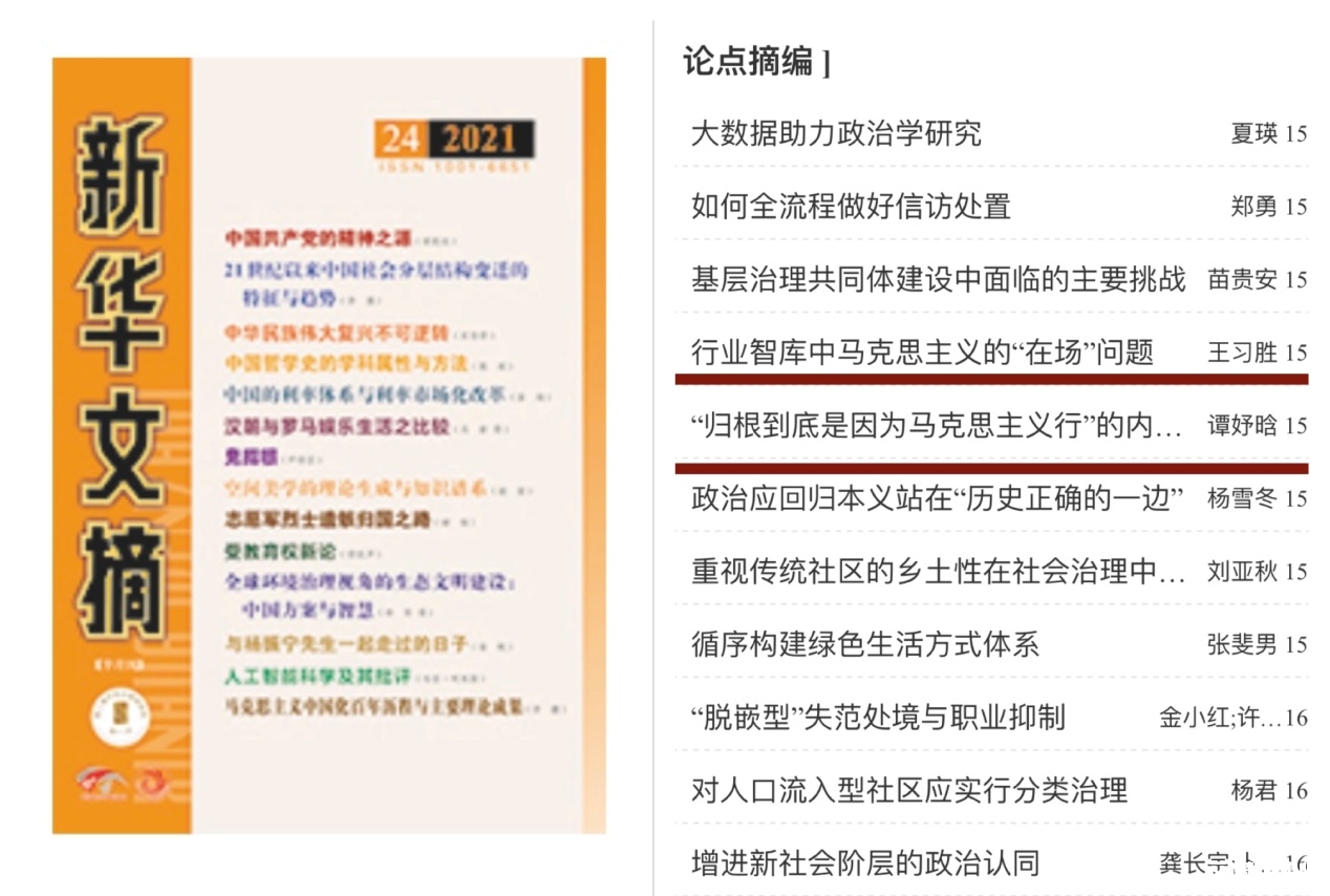 新闻网讯(通讯员 邓佳 孟婉婉)《新葡的京集团8814vip学报》2021年第3期刊发的《“归根到底是因为马克思主义行”的内在逻辑及实践进路》一文被编入《新华文摘》2021年第24期论点摘编。