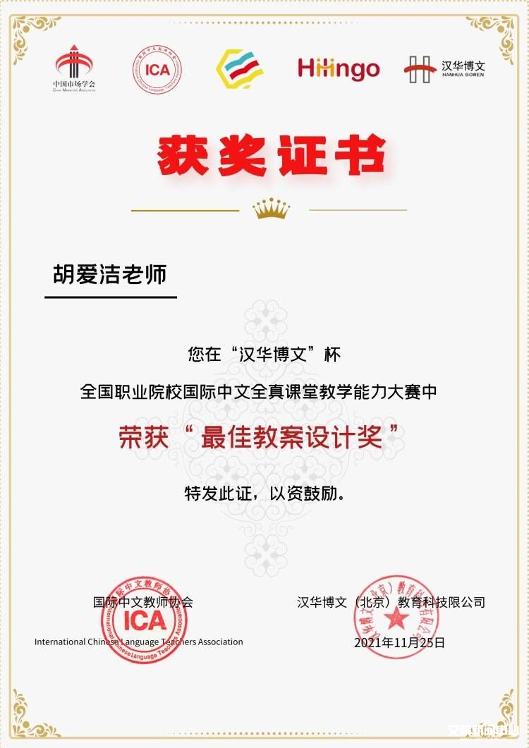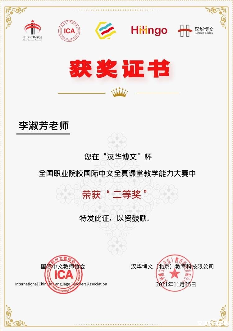 新闻网讯(通讯员 康玲)11月25日,首届“汉华博文”杯全国职业院校国际中文全真课堂教学大赛颁奖仪式线上举行,我校国际汉语教师李淑芳以全国第二名、湖北省第一名的好成绩荣获比赛“二等奖”,胡爱洁老师获“优秀奖”和“最佳教案设计奖”,学校获大赛“最佳组织奖”,外事处处长、国际丝路学院院长杨昌蓉获“优秀组织奖”。