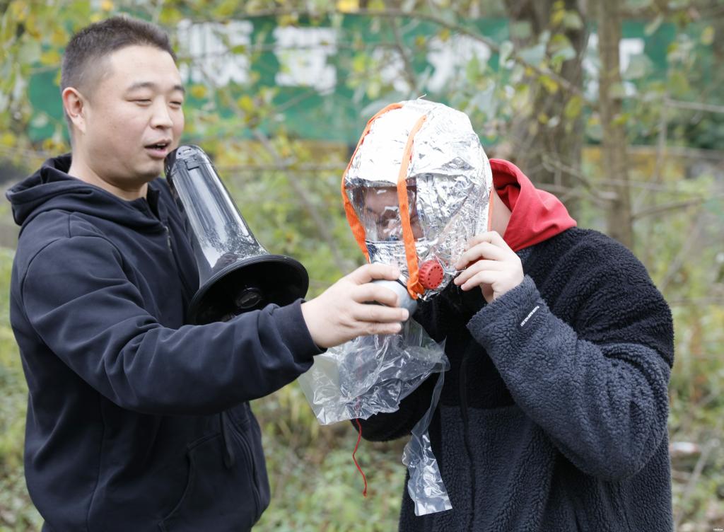 工作人员讲解防毒面具使用方法
