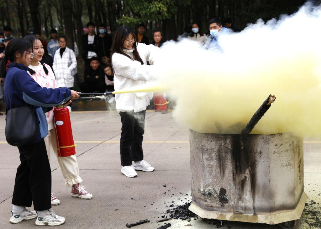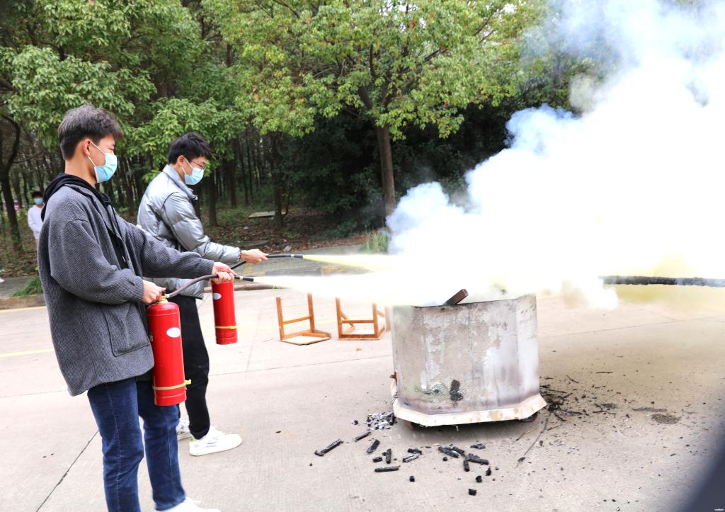 学生现场演练干粉灭火器使用方法
