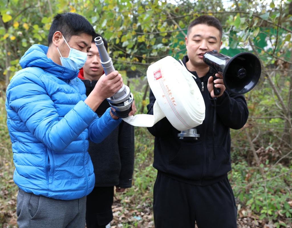 工作人员讲解消防水带使用方法