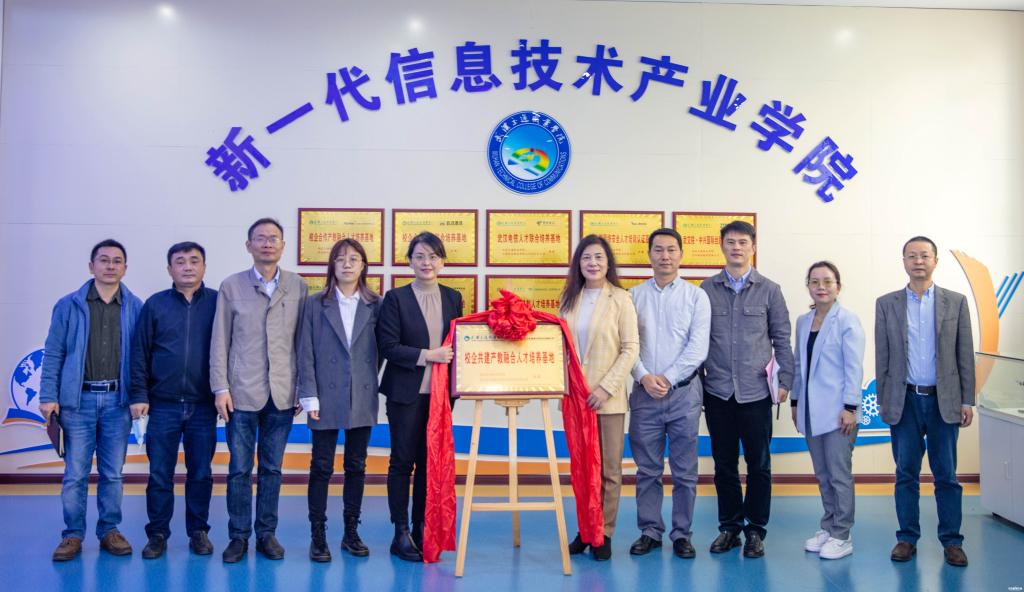 学校副校长姬中英与总裁办总经理郭淼代表双方签约,并共同为产教融合人才培养基地揭牌。