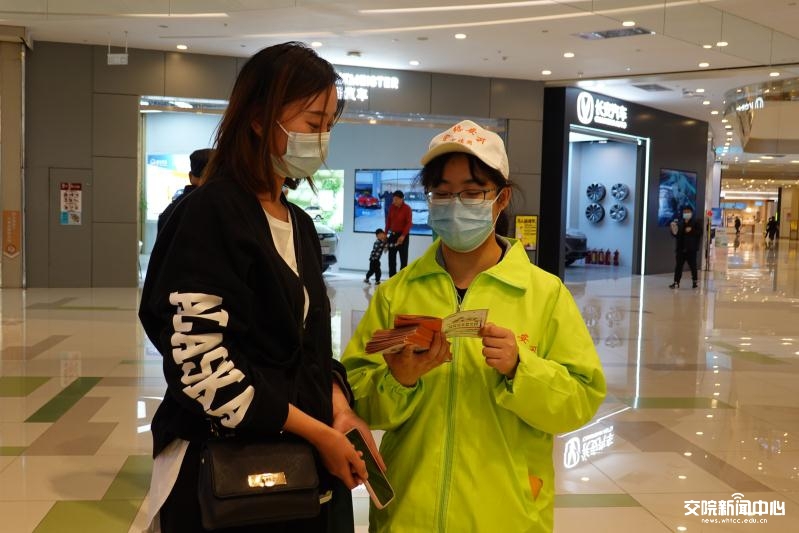 学生志愿者们(着绿色上衣)参与防诈骗宣传手册发放