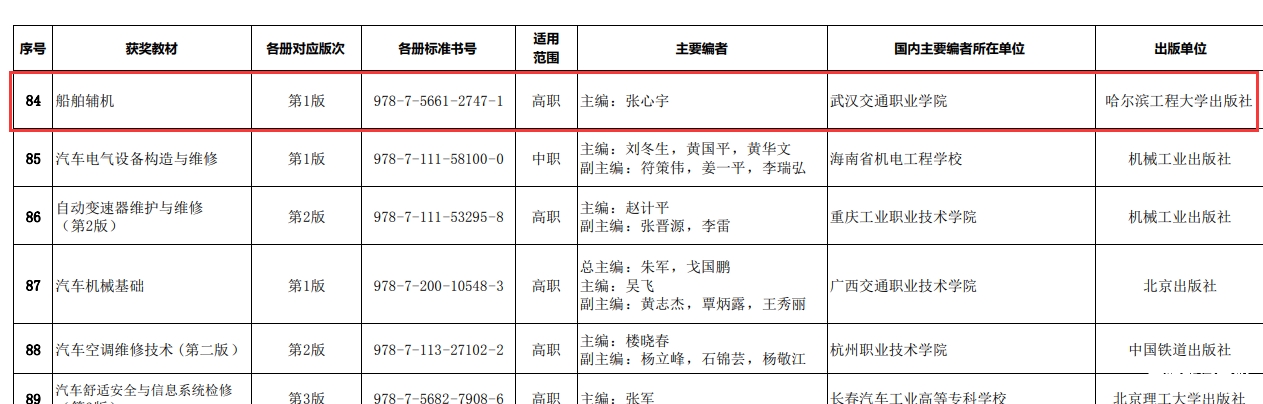 此前7月8日,教育部公示了首届全国教材建设奖拟奖励名单。由学校张心宇老师编著,刘世伟老师、武汉船舶职业技术学院杨双齐老师参编的《船舶辅机》教材2020年7月第1版荣获首届全国教材建设奖二等奖。