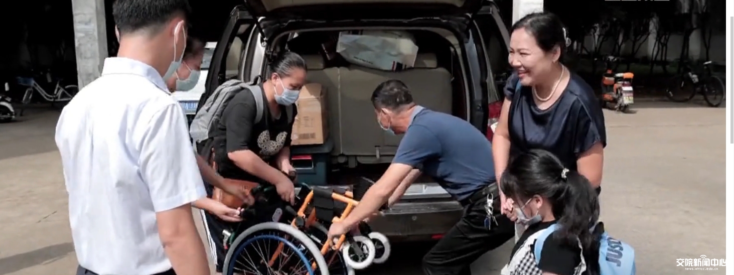 每天下课的时候,同学们推着坐在轮椅上的汤紫妍,一路说说笑笑,有时将她送到宿舍,有时将她送到食堂门口,她的母亲会在门口等着。“阿姨,下课的时间点人太多了,您去了也不一定找得到我们,以后我们送紫妍下课。”同学们对汤紫妍的母亲说。
