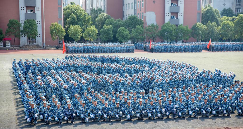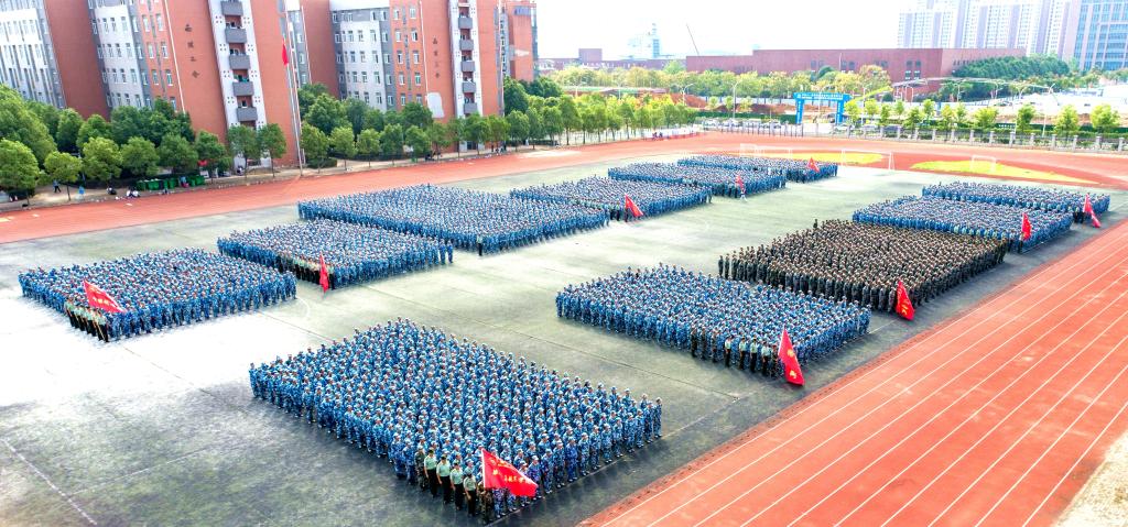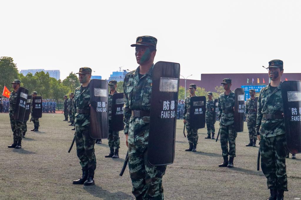新生军训团各营进行风采展示和集体汇演。盾牌操方队和创新方队分别进行汇报展演。盾牌操方队展示了警棍盾牌操及防暴处突队形的变换演练。创新方队分组蹲下、起立,以手势、队列变换出长城、五角星、火箭和南湖红船、中国共产党党徽的形状,展现中国共产党从南湖起航波澜壮阔的百年历程,祝福党的百年华诞,激励同学们心系祖国,奋发向上。