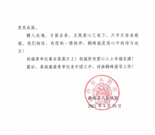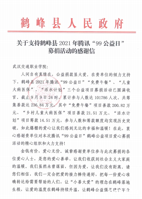 新闻网讯(记者 汪云凤)“如此爆棚的爱心让我们感到无比的幸福和温暖。”“感谢参与此次募捐的各位爱心人士,是您的爱心善举,让我们收获到社会主义大家庭的温暖”。9月10日,学校收到了来自鹤峰县人民政府的感谢信,信中对学校精心组织和大力支持鹤峰县爱心公益项目“免费午餐”表示衷心的感谢。