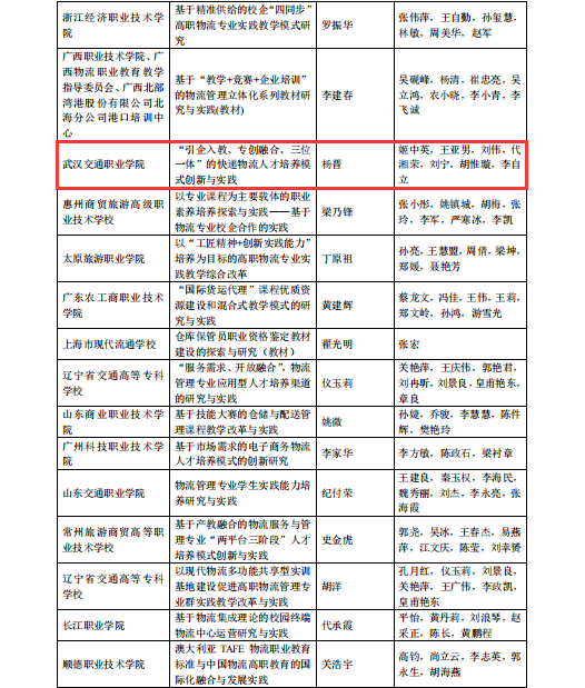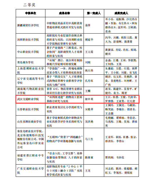 我校副校长梁世翔作为第一完成人的“‘四进一融’横向一体化物流职业教育供应链创新与实践”喜获一等奖;副校长姬中英作为第一完成人的“‘双四级递进’的物流工匠培养路径研究与实践”荣获二等奖;物流学院院长杨晋作为第一完成人的“‘引企入校、专创融合、三位一体’的快递物流人才培养模式创新与实践”荣获二等奖。物流行指委组织专家对教学成果材料进行了初评、网评和会评三个轮次认真评审,根据《通知》要求,兼顾中高职平衡的原则,最后共评出获奖成果 154 项,其中一等奖 27 项、二等奖 53 项、三等奖74 项。