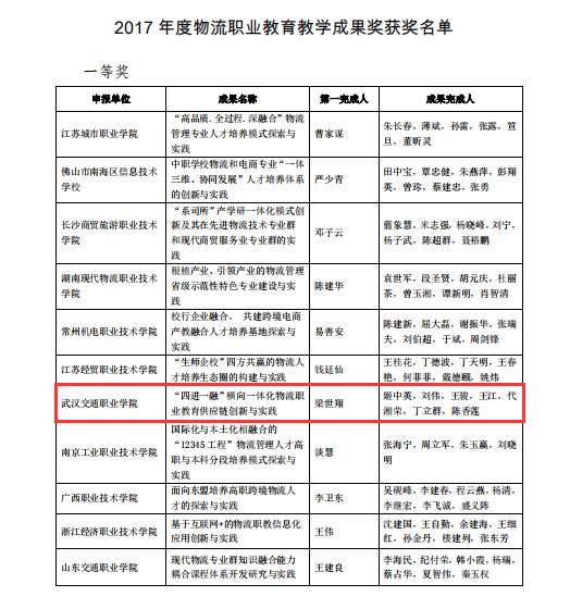 新闻网讯(记者 马琼)根据全国物流职业教育教学指导委员会2018【5】号文,“关于公布2017年度物流职业教育教学成果奖的通知”,我校获得2017年度物流职业教育教学成果奖一等奖一项,二等奖二项!
