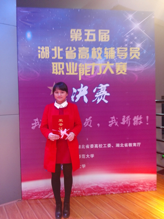 327日下午,决赛在华中师范大学大学生活动中心举行,决赛分为主题演讲、谈心谈话两个环节。校纪委书记李峰亲临比赛现场为选手加油打气并全程指导。向红老师在决赛中也不负众望以精彩的表现征服了在场的评委和观众,最终荣获二等奖(第9名)。不仅如此,向红老师还将代表湖北省参加2016年华中地区辅导员职业能力大赛。