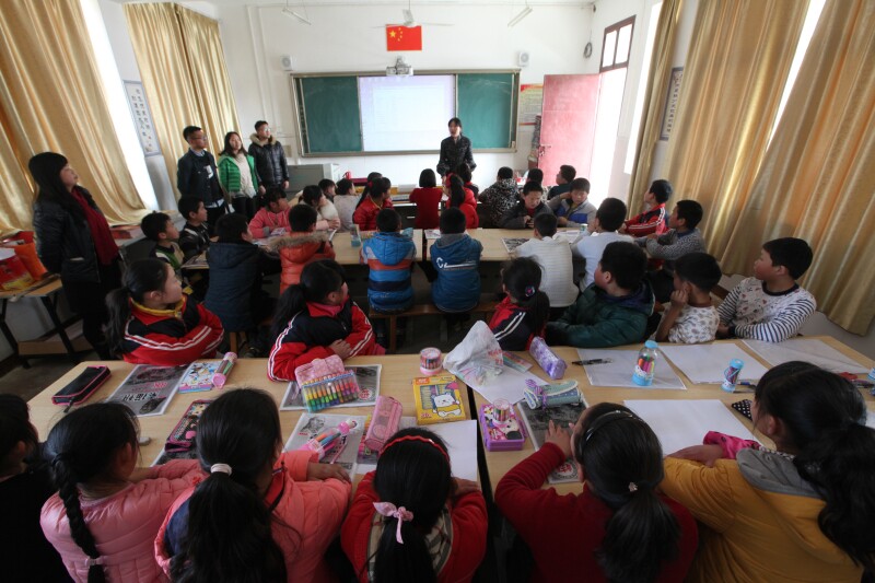 工作组开展“艺术进校园”活动(图为:志愿者指导孩子们绘画)