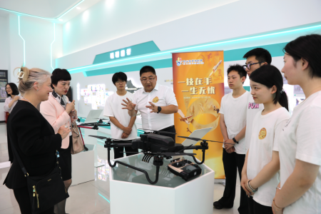 澳大利亚教育代表团一行参观了国家现代物流职教实训基地、汽车学院新能源汽车检测与维修实训区及无人机应用技术产教融合实践中心。该中心集研发、教学、生产于一体的“产学研用”一体化模式,展现了学校对接产业升级的职教创新路径,成为代表团眼中“中国职业教育与产业深度融合的典型样本”。