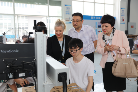 新闻网讯(通讯员 李爽)“非常厉害!这个VR技术可以让学生快速了解到实操的要领。”5月14日下午,在学校国家现代物流职业教育实训基地,澳大利亚驻华大使馆公使衔教育与研究参赞戴瑷伶对学校VR智慧仓储实训系统表示高度肯定。在华工激光现场工程师班,学生正在进行激光裁纸,戴瑷伶表示学生精准实操的能力非常强。