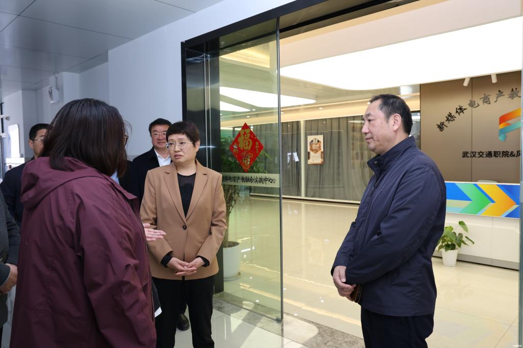 来访嘉宾实地考察了学校新媒体电商产教融合实践中心。经济管理学院王然老师介绍,该中心由学校与湖北风禾集团共建,整合字节跳动、工贸家电、小米等企业资源,创新“课堂工场化、课程项目化、教学实战化”教学模式。中心运营三年来累计培养近千名实践型人才,孵化多支电商创业团队,学生在省级以上电商赛事中斩获多项荣誉。参观人员对实践中心的产教融合深度与育人成效给予高度评价,并就直播运营、新媒体电商人才培养、团队管理等内容展开深入讨论。