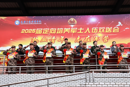 在激昂的氛围中,接兵部队领导和校领导为入伍军士生代表颁发入伍通知书,佩戴大红花。大红花鲜艳夺目,映衬着军士生们朝气蓬勃的脸庞,他们脸上洋溢着自豪与喜悦,那是即将奔赴梦想的激动与荣耀。