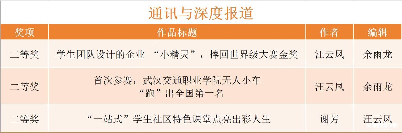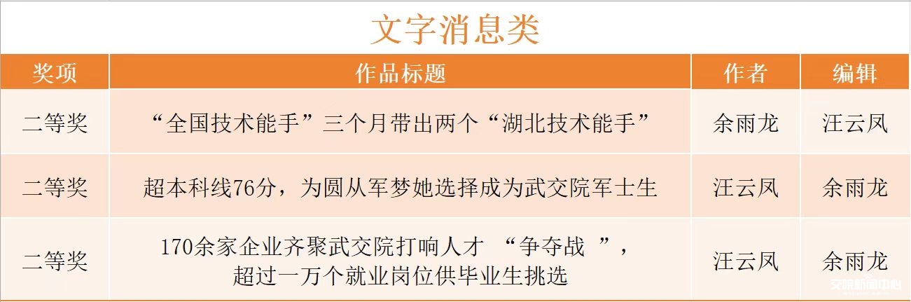 我校获得湖北高校新闻奖一等奖的作品分别是标题类《“学生成长手册”成为伴随大学的“私人顾问”》《“百校百馆”开馆首日,武新葡来了一群“红领巾”》。获得二等奖的作品是标题类:《全国三所,湖北唯一!我校资助数字化工作案例入选教育部优秀典型案例》;文字消息类:《“全国技术能手”三个月带出两个“湖北技术能手”》《超本科线76分,为圆从军梦她选择成为武新葡军士生》《170余家企业齐聚武新葡打响人才“争夺战”,超过一万个就业岗位供毕业生挑选》;通讯与深度报道类:《学生团队设计的企业“小精灵”,捧回世界级大赛金奖》《首次参赛,新葡的京集团8814vip无人小车 “跑”出全国第一名》《“一站式”学生社区特色课堂点亮出彩人生》。