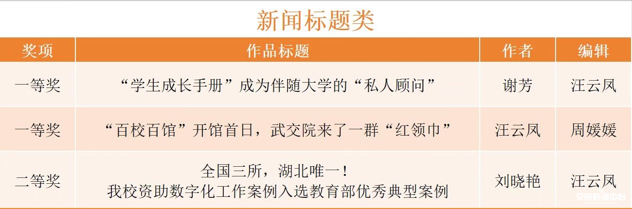 湖北高校新闻奖是湖北高校新闻作品的最高荣誉,由湖北省新闻工作者协会高校分会组织实施评审,会员单位来自全省各本科院校和职业院校。