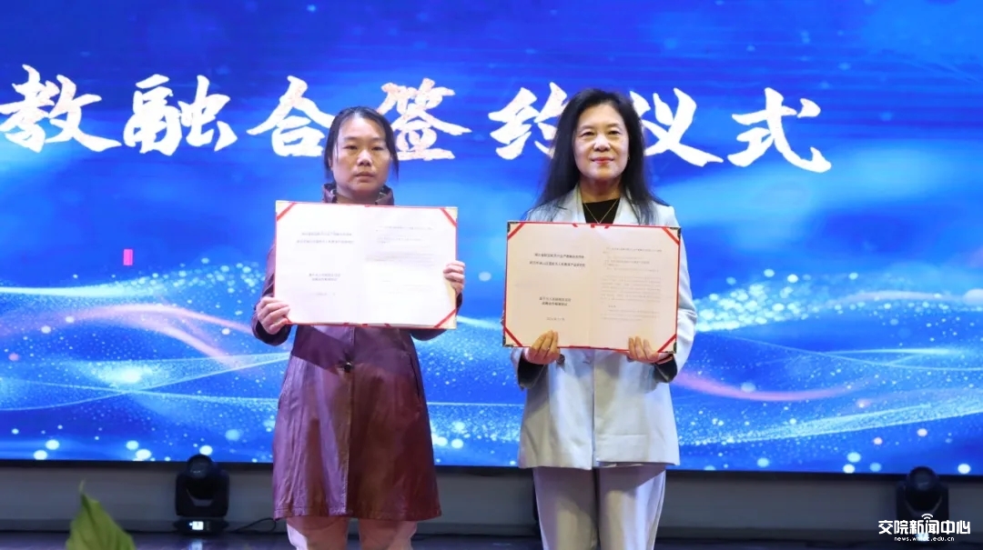 副校长姬中英代表湖北省航空航天行业产教融合共同体与武汉工程大学邮电与信息工程学院自动化教研室主任、武汉市洪山区昱航无人机教育产业研究院秘书长李艳红进行产教融合签约仪式。