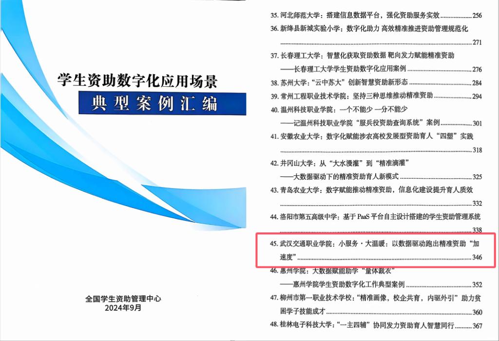 据悉,《学生资助数字化应用场景典型案例》是全国学生资助管理中心从省、市、县各级教育行政部门,大、中、小、幼儿园各级各类学校的近300个案例中好中选优、优中选强,精选53个典型案例编撰而成,全国仅有3所职业院校入选,我校是湖北省地方高校唯一入选单位。学校资助工作成果首次得到教育部高度评价。