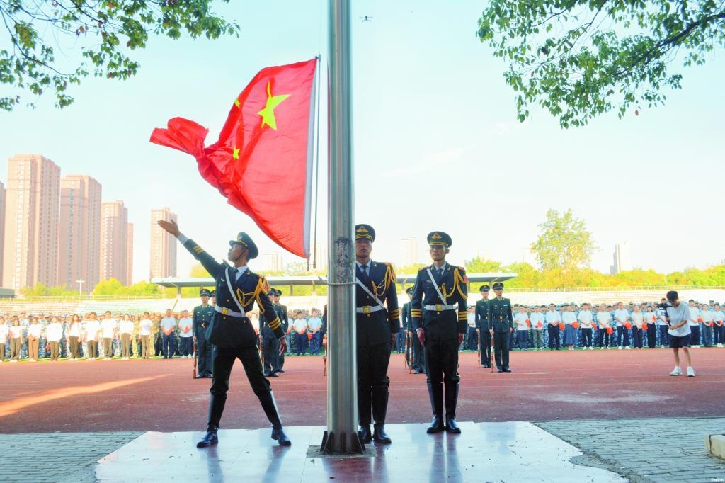 “我和我的祖国一刻也不能分割,无论我走到哪里都流出一首赞歌……”全体师生高唱《我和我的祖国》,歌声回荡在操场上空。