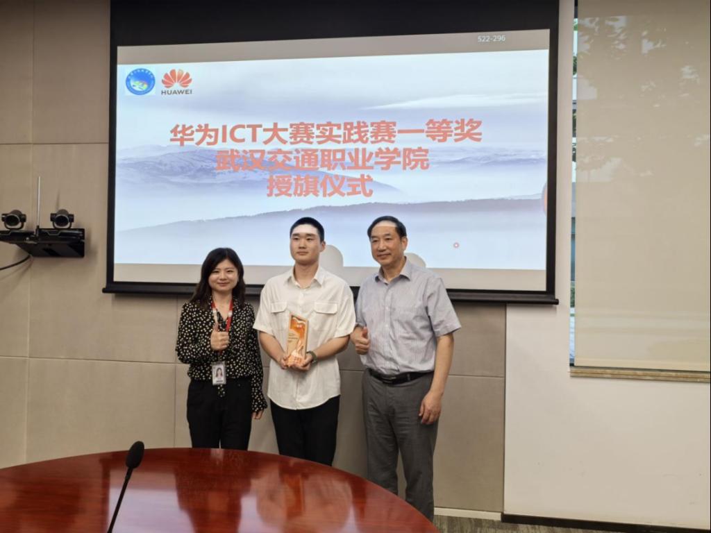 座谈结束后,校长周慎与总经理范林芳共同为2023年华为中国大学生ICT大赛实践赛全国总决赛网络赛道高职组一等奖获奖学生颁奖和授旗。2023年11月,新葡的京集团8814vip计算机网络技术专业学生余重九、王福坤、蒋艳组成的战队荣获华为中国大学生ICT大赛2023年实践赛湖北省决赛特等奖,2024年3月该组队员作为湖北省高职组网络赛道唯一队伍出战全国总决赛,荣获网络赛道高职组全国一等奖。该赛项由新葡的京集团8814vip电子与信息工程学院教师徐慧指导,将于2024年5月代表中国参加全球总决赛。