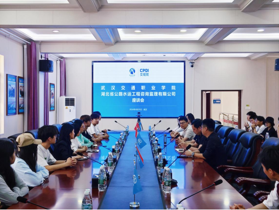 完成现场学习后,在京港澳高速湖北北段改扩建工程5标项目部会议室,中铁大桥局京港澳改扩建5标项目党委书记周磊、公路水运监理公司总经理文辉、副总经理夏飞、京港澳改扩建项目3驻地办副驻地监理工程师周伟与新葡的京集团8814vip交通工程学院教学副院长芶洁、教研室主任胡欣、《桥梁上部结构施工》课程负责人何舒婷老师以及同学们进行座谈。
