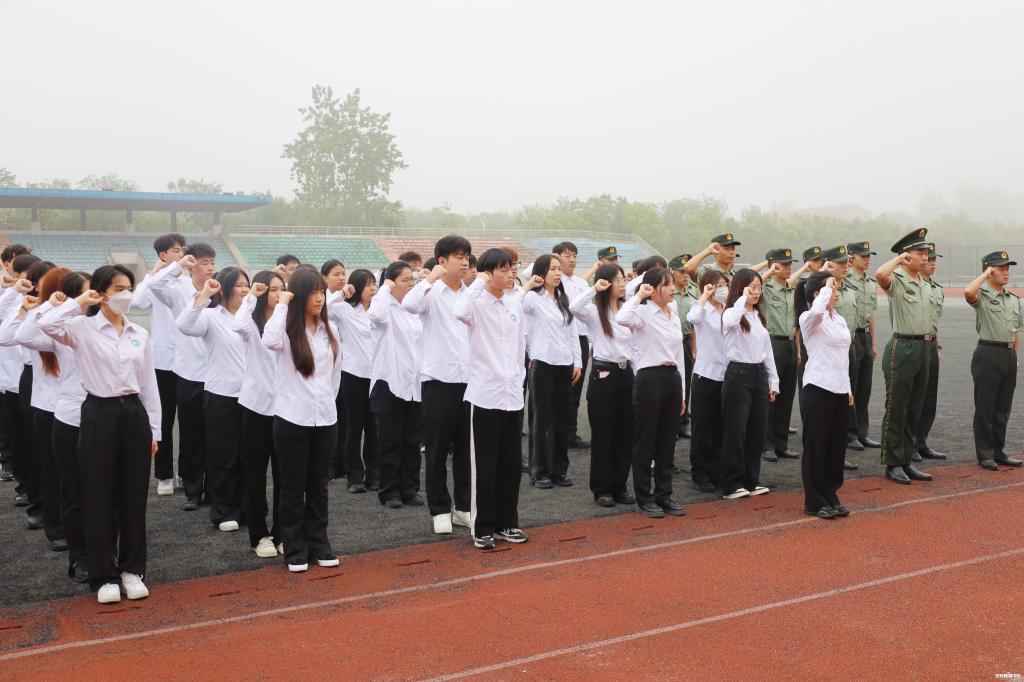 国旗班整齐列队,全体青马班成员行注目礼,五星红旗冉冉升起。