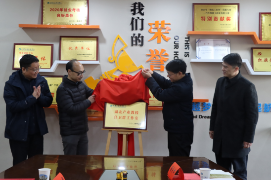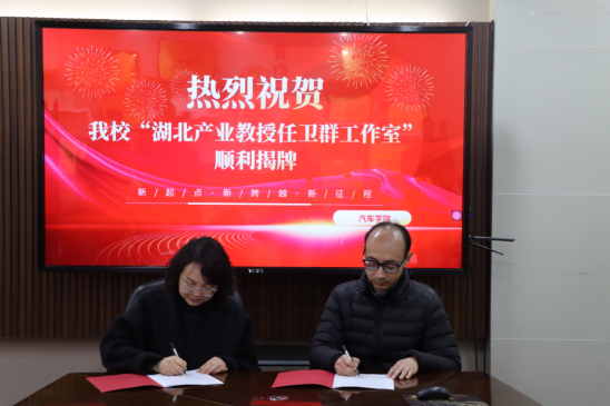 学校副校长陈宏伟、东风商用车有限公司人力资源部技术中心人力资源开发科科长邹大刚、东风商用车有限公司技术总师任卫群、学校教务处处长王炜共同为“湖北产业教授”工作室揭牌。