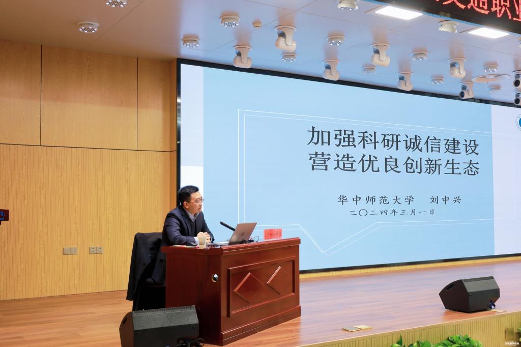 新闻网讯  3月1日下午,学校科技与社会服务处举办科研能力提升专题培训。本次培训邀请了华中师范大学社科处副处长、博士生导师刘中兴教授,作题为《加强科研诚信建设营造良好创新生态》专题培训。培训会由科技与社会服务处处长袁武主持,学校专任教师及校、院两级学术委员会委员300余人参加了学习。