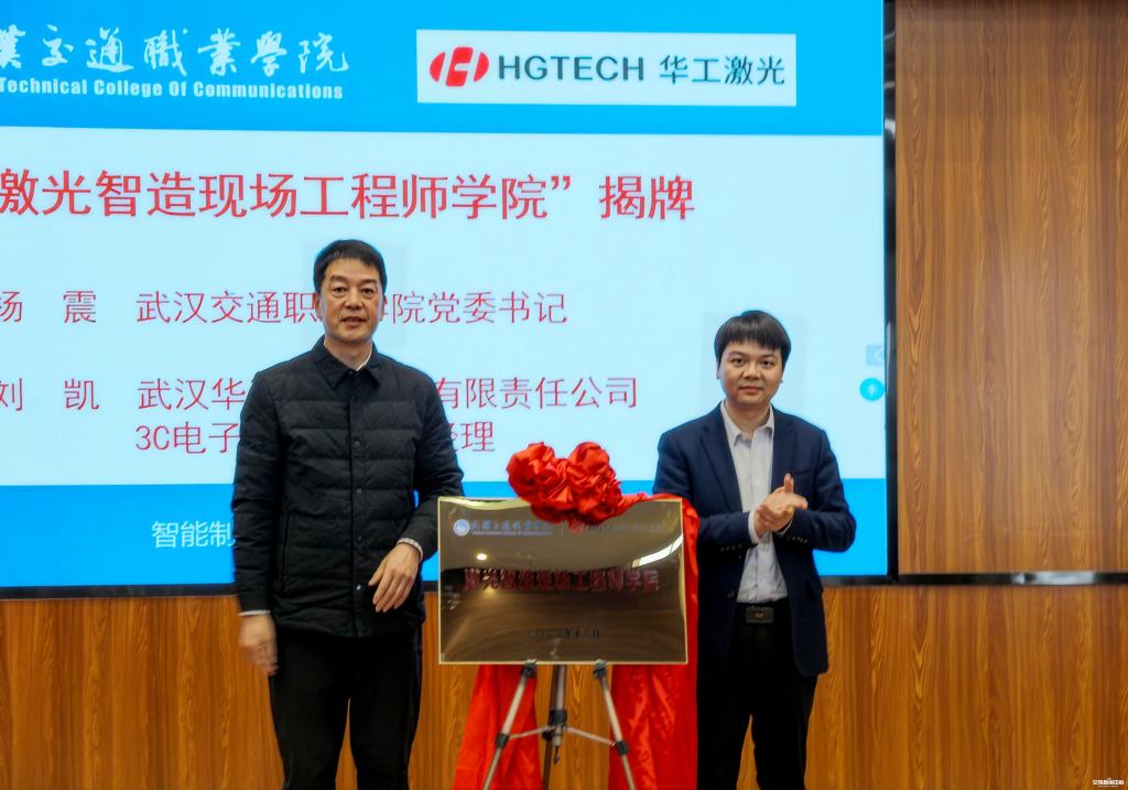 杨震与刘凯、王炜与陈猛、阮谦与程文涛携手合作为“激光智造现场工程师学院”、“华工激光现场工程师班”、“激光加工现场工程师实践基地”揭牌。