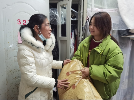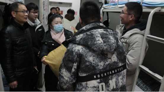 在学生宿舍里,胡迎九嘱咐同学们都要积极参加技能大赛,鼓励同学们走出寝室,珍惜学习时间,利用好各种平台和机会锻炼自己。赵新关心同学们冷不冷,思想导师姜晓玲提醒同学们注意安全,朱婧老师提醒同学们保持宿舍卫生。老师们为需要帮助的同学送上棉服和棉被,将温暖和关心传递到学生心里。