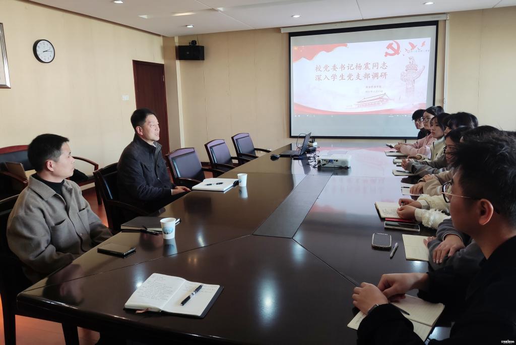 新闻网讯(记者 周婷)11月23日下午,党委书记杨震来到经济管理学院学生党支部开展调研,并与学生党员座谈交流。经济管理学院党总支书记何承云、毕业生辅导员周婷及毕业生党员参会。