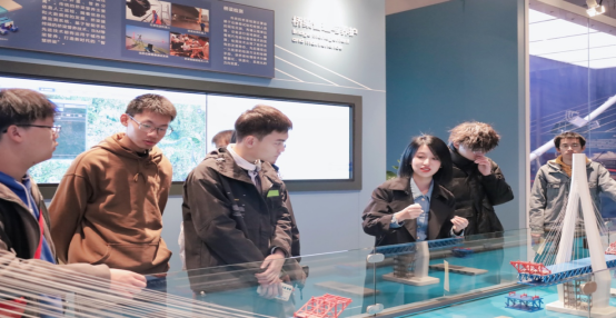 场馆内由古至今各类桥梁布景生动鲜活,同学们在移步换景中一同回顾中国桥梁发展的历史和成就。交通工程学院何舒婷老师以桥梁专业视角向同学们科普了斜拉桥的施工技术,从基础、索塔、主梁、斜拉索的施工技术展现新时代桥梁建设的技术成就。