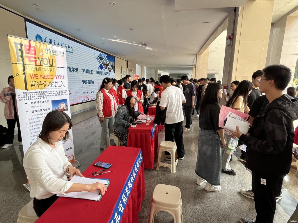 新闻网讯(通讯员 陶松桥)11月3日,学校举行2023年科教融汇服务湖北县域经济专场招聘会。湖北谷拓光电科技有限公司、润邦茶业(武汉)有限公司、长飞光纤潜江有限公司、长城汽车股份有限公司荆门分公司、长芯盛(汉川)科技有限公司、天门武住电装有限公司等14家企业,在当地人力资源和社会保障部门的组织下入校招聘。
