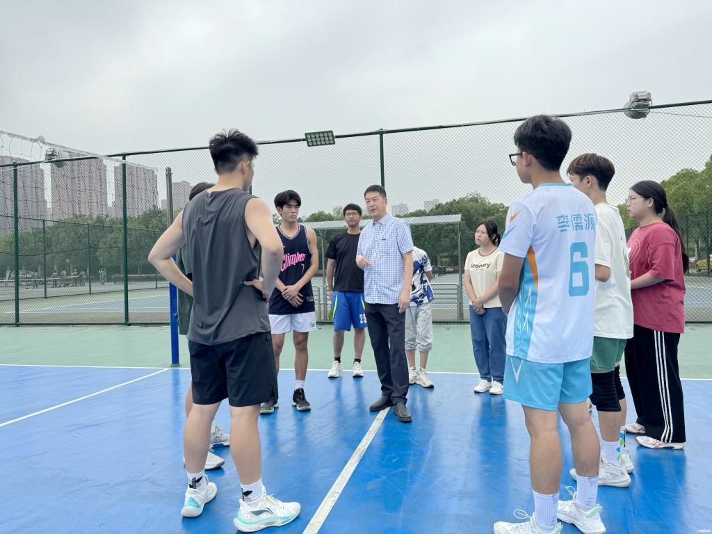 球场上热闹非凡,杨震与同学们同场竞技,挥汗球场。边比赛边对学生的发球、垫球、上网扣球进行了技术讲解和动作要点分析,针对比赛战术和赛场轮位做出了精准调整指导。