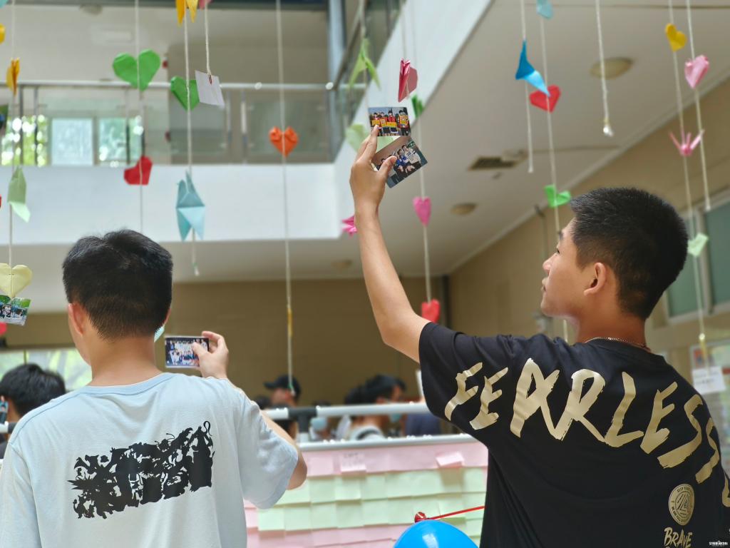 毕业生们驻足在千纸鹤中,认真地去回望那个曾经青涩的自己,在签名墙上写下自己的名字和对母校的祝福。