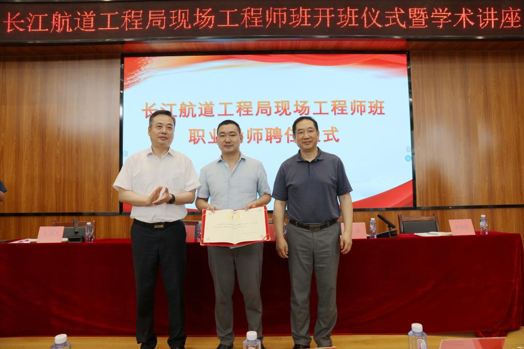长江航道工程局副总经理宁晓东、校长周慎为“现场工程师班”职业导师颁发聘书。