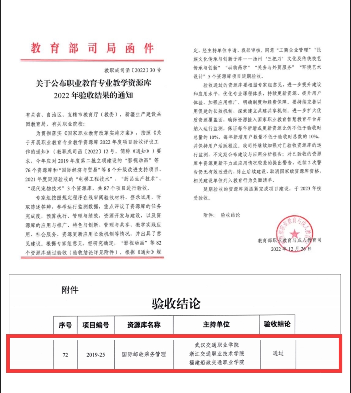 新闻网讯(通讯员 鄢向荣)近日,教育部发布《关于公布职业教育专业教学资源库2022年验收结果的通知》(教职成司函〔2022〕30号),我校作为第一主持单位组织建设的职业教育国际邮轮乘务管理专业国家级教学资源库项目(项目编号:2019-25)正式通过教育部验收。