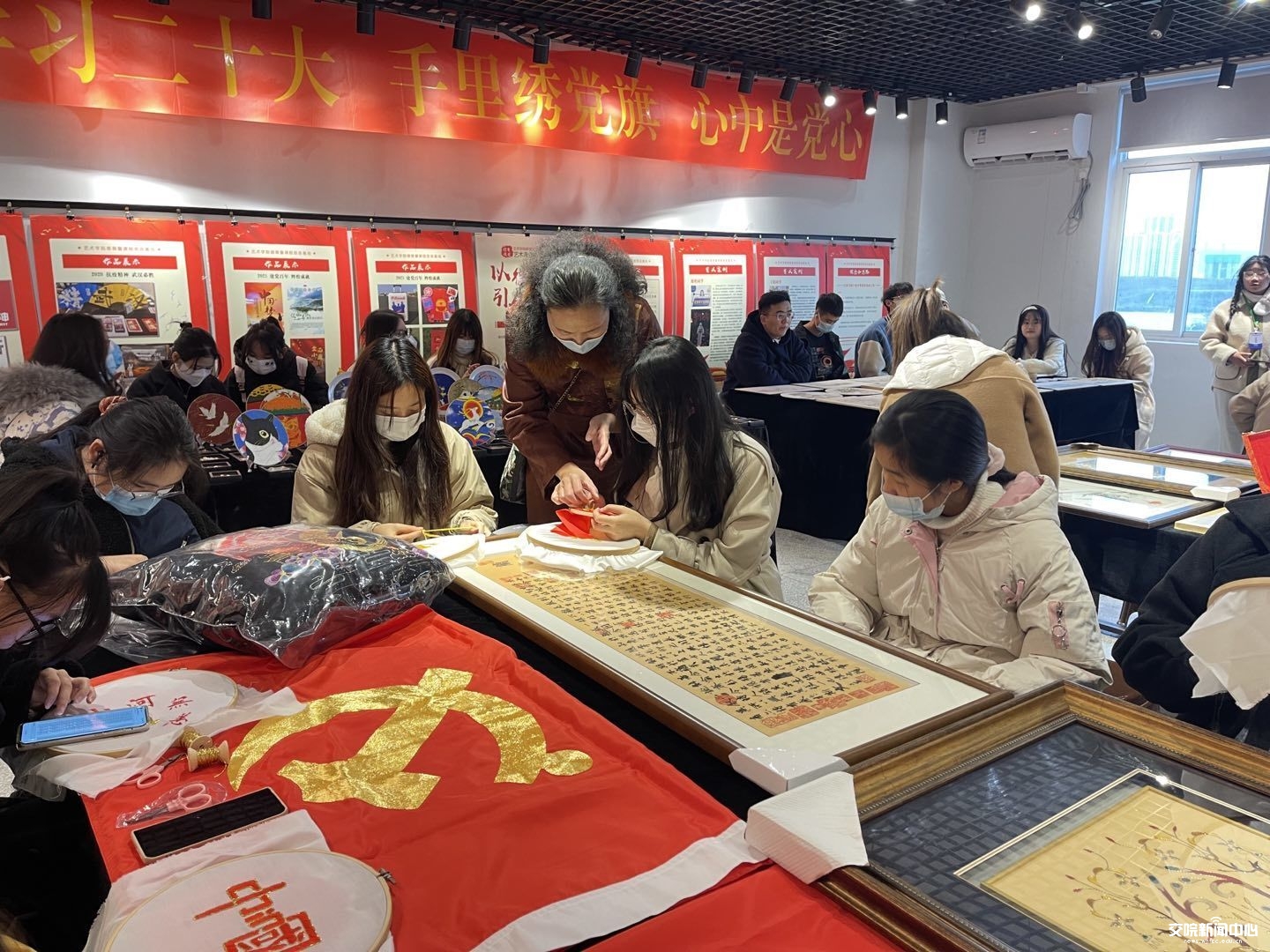 新闻网讯(记者 张丽)12月1日下午,教学楼南709艺术学院德育暨课程思政基地,艺术学院“学习二十大 手里绣党旗 心中是党心”党建+产教融合活动现场,学生和入党积极分子在湖北汉绣协会会长、非遗传承人陈慧老师的现场指导下,通过手绣党旗表达心中党心,学习二十大精神。