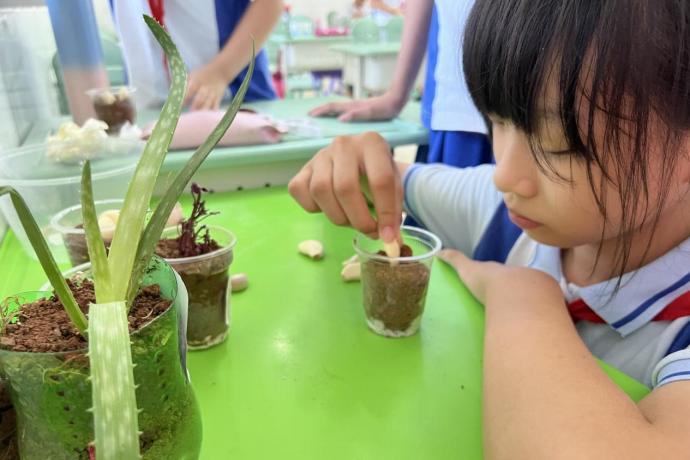 小朋友用塑料杯种植大蒜