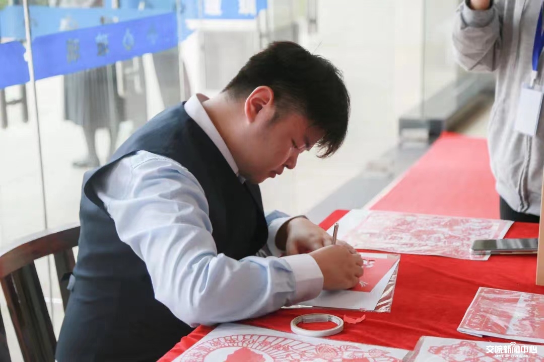 明德楼一楼大厅里一排排栩栩如生的剪纸画映入大家的眼帘,这是交通服务与管理学院的“飞Young剪纸社”的作品,本次展示的作品主要有中国历史、抗战疫情、典型人物等,现场同学们也在精心的刻画着画面。社长姜梦媛说:“剪纸是中国优秀传统文化,需要我们去继承和弘扬,在剪纸过程中可以让浮躁的心沉静下来,不断地修炼自己的内心,我喜欢去做。”